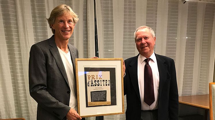 Michael Cocke, ordförande för Svenska Assitej, lämnar över priset till Stanislav Brosowski. Foto: Lena Stefenson