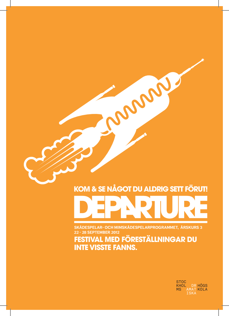DEPARTURE på Stockholms dramatiska högskola ger studenter möjlighet att självständigt undersöka sitt personliga och konstnärliga uttryck. Resultatet är 23 pjäser om allt från föräldraskap, maktmissbruk, rasism och våld till frågor om godhet, ålderdom, actionhjältar, datorer, Josephine Baker, B-filmer och en kvinna som vill bli en ko!