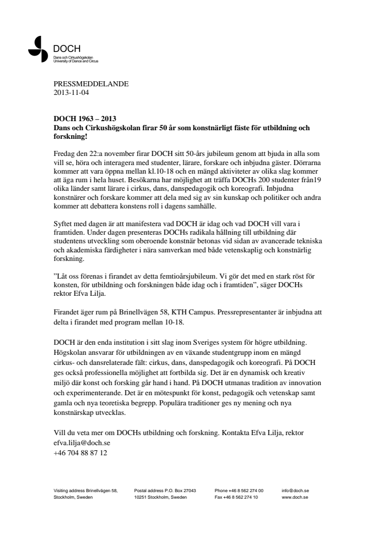 Fredag den 22:a november firar DOCH sitt 50-års jubileum genom att bjuda in alla som vill se, höra och interagera med studenter, lärare, forskare och inbjudna gäster. Dörrarna kommer att vara öppna mellan kl.10-18 och en mängd aktiviteter av olika slag kommer att äga rum i hela huset. Besökarna har möjlighet att träffa DOCHs 200 studenter från19 olika länder samt lärare i cirkus, dans, danspedagogik och koreografi. Inbjudna konstnärer och forskare kommer att dela med sig av sin kunskap och politiker och andra kommer att debattera konstens roll i dagens samhälle.