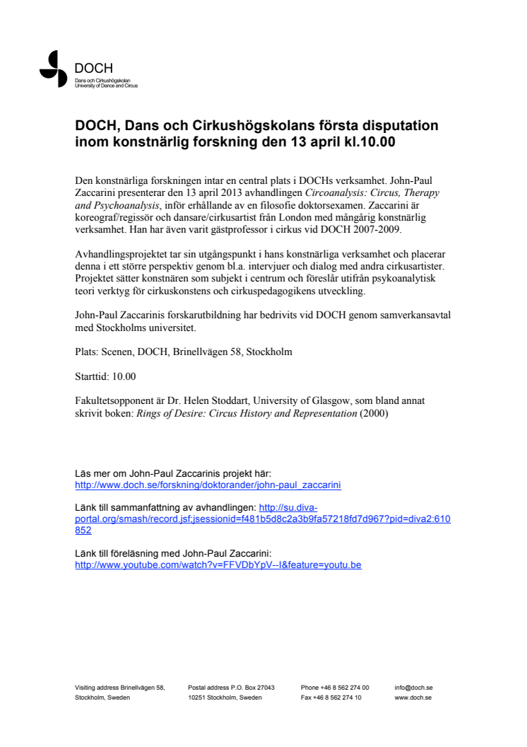Den konstnärliga forskningen intar en central plats i DOCHs verksamhet. John-Paul Zaccarini presenterar den 13 april 2013 avhandlingen Circoanalysis: Circus, Therapy and Psychoanalysis, inför erhållande av en filosofie doktorsexamen.