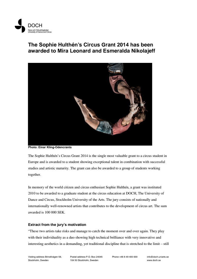 The Sophie Hulthén’s Circus Grant 2014 is the single most valuable grant to a circus student in Europe and is awarded to a student showing exceptional talent in combination with successful studies and artistic maturity. The grant can also be awarded to a group of students working together. In memory of the world citizen and circus enthusiast Sophie Hulthén, a grant was instituted 2010 to be awarded to a graduate student at the circus education at DOCH, The University of Dance and Circus, Stockholm University of the Arts. The jury consists of nationally and internationally well-renowned artists that contributes to the development of circus art. The sum awarded is 100 000 SEK.