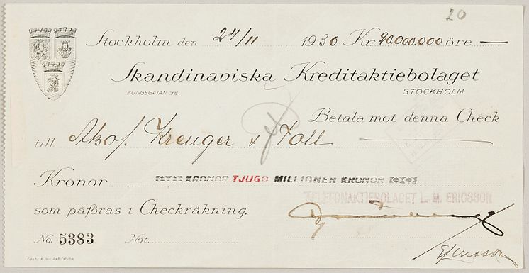 KREUGER & TOLL, CHECK FRÅN L.M. ERICSSON, 20 miljoner kr, daterad 1930