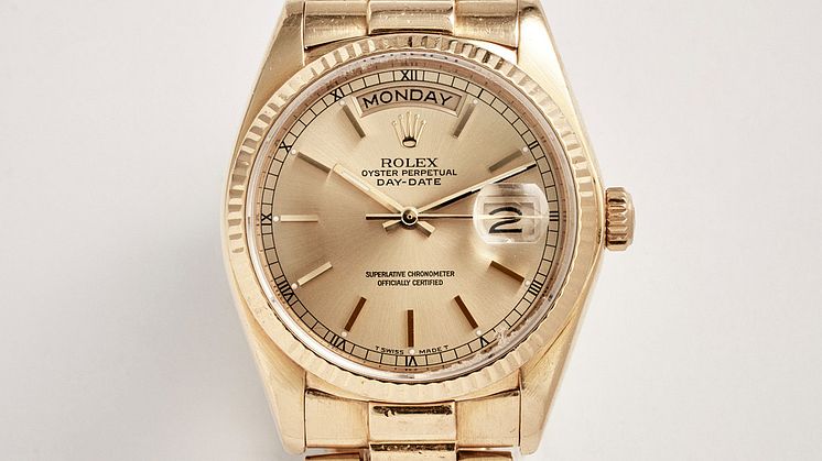 Auktionen avslutades med en exklusiv samling klockor, där Rolex armbandsur “Day-Date” landade på högsta notering om 145 481 kr.