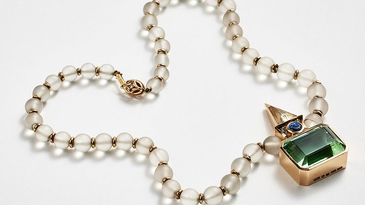Varje enskilt smycke skapades helt fristående och alltid med en specifik person i åtanke. Mellan 1979 och 1985 komponerade han framförallt storslagna halsband med kaskader av koraller, akvamariner och pärlor som fästes samman av enorma lås i smyckets mitt. En av dessa halskragar ser vi nu i Moderna & Nutida, ett sprakande collier med röda koraller och trumlade turkoser – essensen av den dekor och egensinniga dramatik som definierade Kristian Nilssons smyckeskonst.