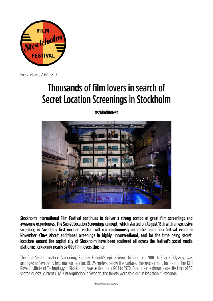 The Secret Location Screenings concept, which started on August 13th with an exclusive screening in Sweden’s first nuclear reactor, will run continuously until the main film festival event in November.