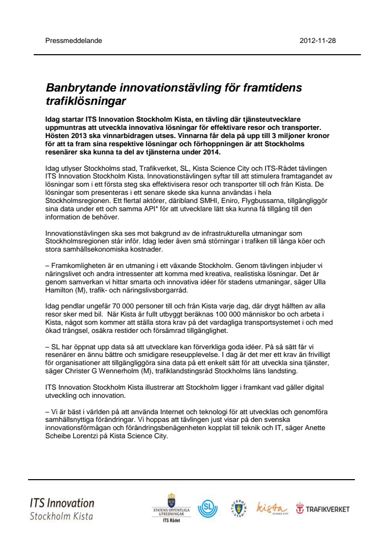 Idag startar ITS Innovation Stockholm Kista, en tävling där tjänsteutvecklare uppmuntras att utveckla innovativa lösningar för effektivare resor och transporter. Hösten 2013 ska vinnarbidragen utses. Vinnarna får dela på upp till 3 miljoner kronor för att ta fram sina respektive lösningar och förhoppningen är att Stockholms resenärer ska kunna ta del av tjänsterna under 2014.
