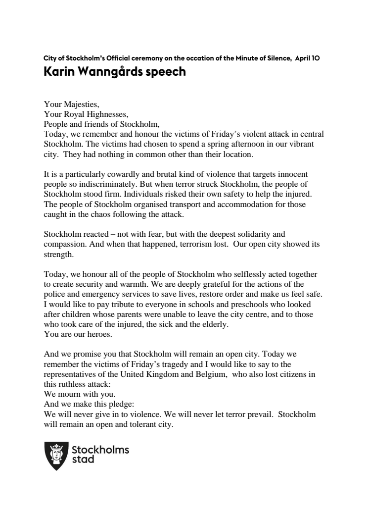English programme: The City of Stockholm’s Official ceremony on the occasion of the Minute of Silence, April 10 2017