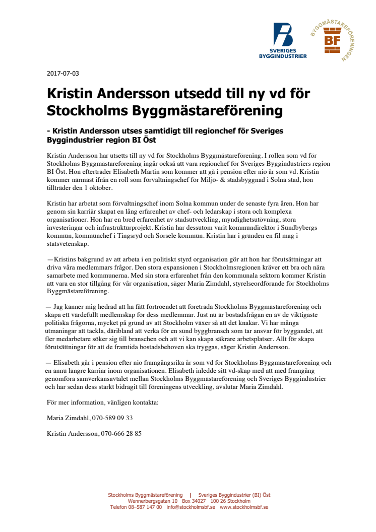 Kristin Andersson utses till ny vd för Stockholms Byggmästareförening. I rollen som vd för Stockholms Byggmästareförening ingår också att vara regionchef för Sveriges Byggindustriers region BI Öst.