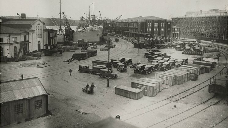 På 100 år har mycket förändrats i hamnen. Här ser vi driftklara bilar förpackade i lådor anlända frihamnen 1926. Numera kommer nästan allt gods förpackat i containrar och när hamnen i Norvik utanför Nynäshamn är klar kommer containerverksamheten att flyttas dit. De första fartygen planerar att kunna anlöpa Norvik i maj 2020.