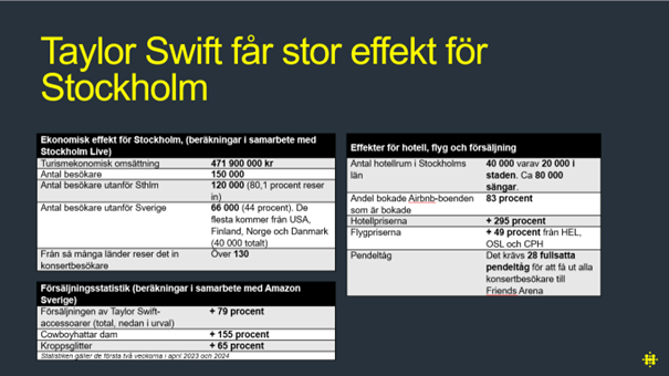 I maj genomför Taylor Swift tre konserter på Friends Arena i Solna, vilket blir hennes enda turnéstopp i Norden. Stockholms Handelskammare har tidigare räknat ut att konsertbesökarna väntas spendera en halv miljard under sin tid i Stockholm. Nu visar en ny analys som Stockholms Handelskammare sammanställt att flyg- och hotellpriser ökar kraftigt. Dessutom visar nya beräkningar som Stockholms Handelskammare tagit fram i samarbete med Amazon Sverige att försäljningen av accessoarer ökar lavinartat.