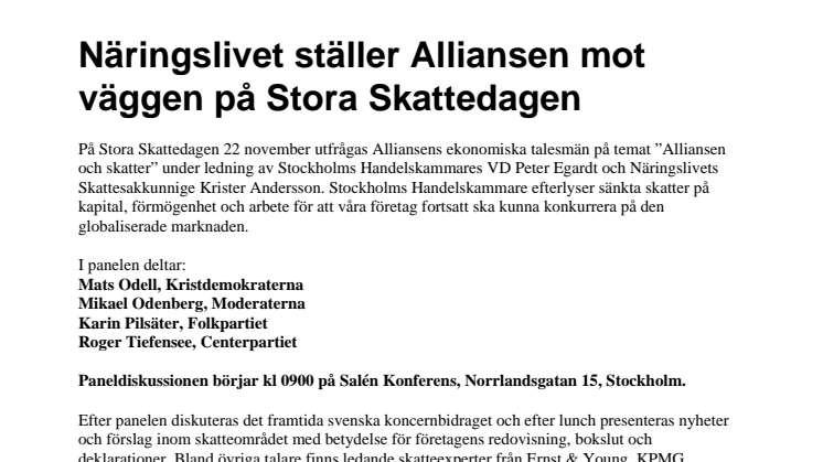På Stora Skattedagen 22 november utfrågas Alliansens ekonomiska talesmän på temat Alliansen och skatter under ledning av Stockholms Handelskammares VD Peter Egardt och Näringslivets Skattesakkunnige Krister Andersson. Stockholms Handelskammare efterlyser sänkta skatter på kapital, förmögenhet och arbete för att våra företag fortsatt ska kunna konkurrera på den globaliserade marknaden.