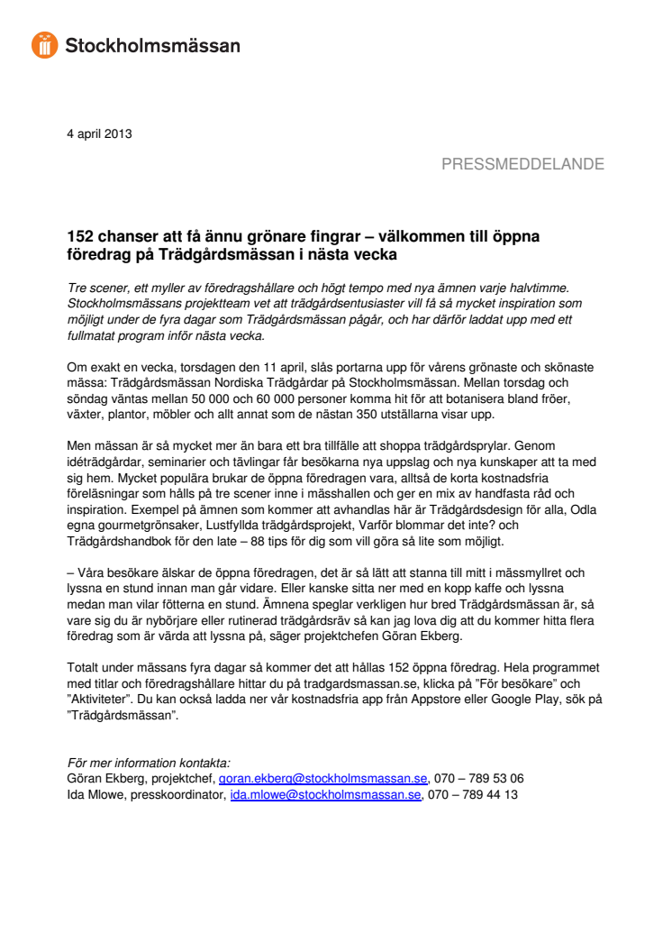 Tre scener, ett myller av föredragshållare och högt tempo med nya ämnen varje halvtimme. Stockholmsmässans projektteam vet att trädgårdsentusiaster vill få så mycket inspiration som möjligt under de fyra dagar som Trädgårdsmässan pågår, och har därför laddat upp med ett fullmatat program inför nästa vecka.