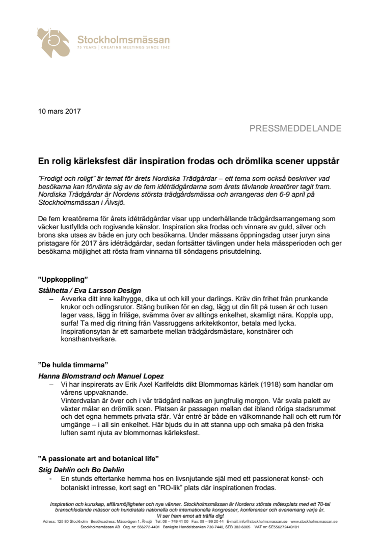 ”Frodigt och roligt” är temat för årets Nordiska Trädgårdar – ett tema som också beskriver vad besökarna kan förvänta sig av de fem idéträdgårdarna som årets tävlande kreatörer tagit fram. Nordiska Trädgårdar är Nordens största trädgårdsmässa och arrangeras den 6-9 april på Stockholmsmässan i Älvsjö.