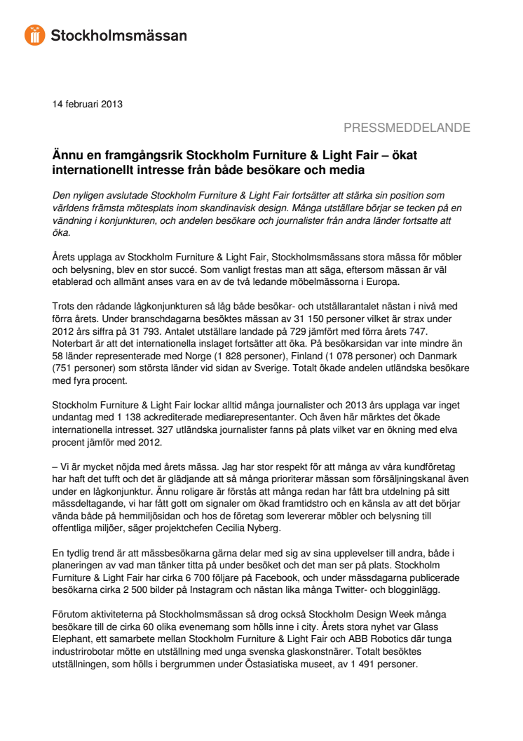 Den nyligen avslutade Stockholm Furniture & Light Fair fortsätter att stärka sin position som världens främsta mötesplats inom skandinavisk design. Många utställare börjar se tecken på en vändning i konjunkturen, och andelen besökare och journalister från andra länder fortsatte att öka.