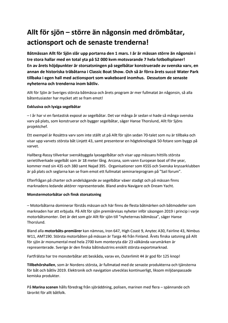 En av årets höjdpunkter är storsatsningen på segelbåtar konstruerade av svenska varv, en annan de historiska träbåtarna i Classic Boat Show. Och så är förra årets succé Water Park tillbaka i egen hall med actionsport som wakeboard inomhus. Dessutom de senaste nyheterna och trenderna inom båtliv.