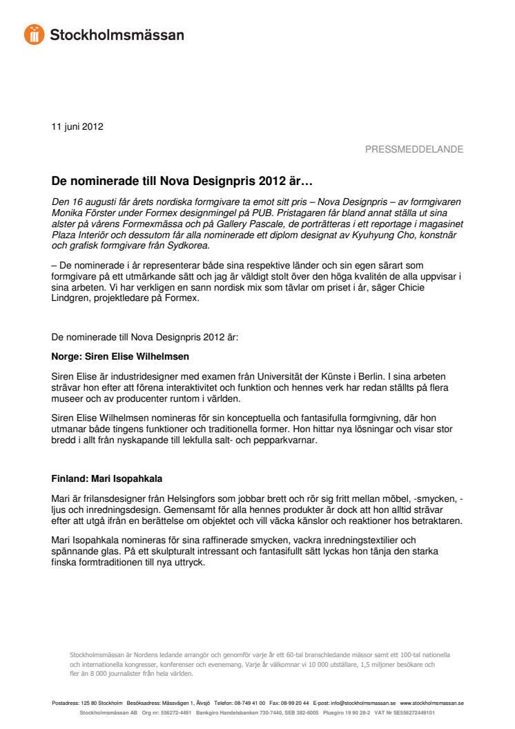 Den 16 augusti får årets nordiska formgivare ta emot sitt pris – Nova Designpris – av formgivaren Monika Förster under Formex designmingel på PUB. Pristagaren får bland annat ställa ut sina alster på vårens Formexmässa och på Gallery Pascale, de porträtteras i ett reportage i magasinet Plaza Interiör och dessutom får alla nominerade ett diplom designat av Kyuhyung Cho.