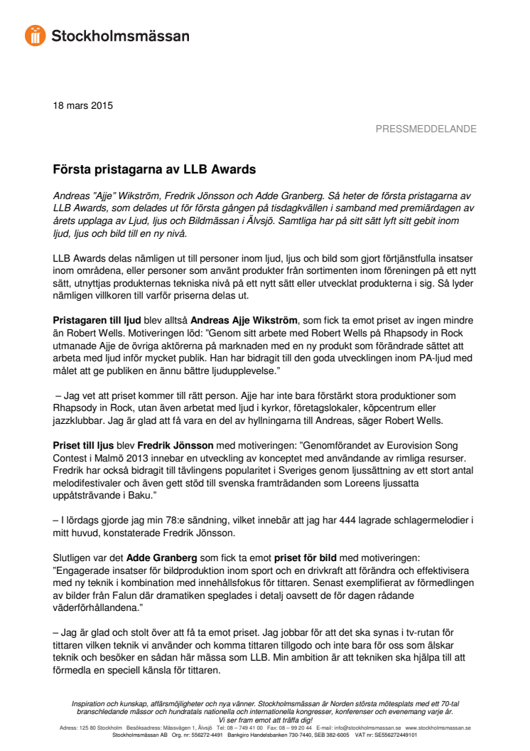 Andreas ”Ajje” Wikström, Fredrik Jönsson och Adde Granberg. Så heter de första pristagarna av LLB Awards, som delades ut för första gången på tisdagkvällen i samband med premiärdagen av årets upplaga av Ljud, ljus och Bildmässan i Älvsjö. Samtliga har på sitt sätt lyft sitt gebit inom ljud, ljus och bild till en ny nivå.