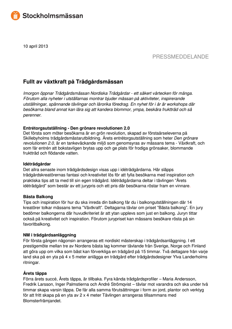 Imorgon öppnar Trädgårdsmässan Nordiska Trädgårdar - ett säkert vårtecken för många. Förutom alla nyheter i utställarnas montrar bjuder mässan på aktiviteter, inspirerande utställningar, spännande tävlingar och lärorika föredrag. En nyhet för i år är workshops där besökarna bland annat kan lära sig att kandera blommor, ympa, beskära fruktträd och så perenner.