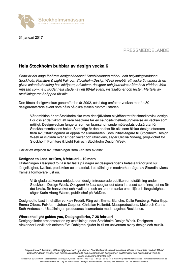 Snart är det dags för årets designhändelse! Kombinationen möbel- och belysningsmässan Stockholm Furniture & Light Fair och Stockholm Design Week innebär att vecka 6 numera är en given kalenderbokning hos inköpare, arkitekter, designer och journalister från hela världen. Med mässan som nav, sjuder hela staden av ett 80-tal event, installationer och fester.