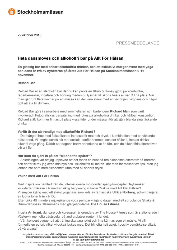 En skön oas med enbart alkoholfria drinkar, och ett exklusivt morgonevent med yoga och dans är två av nyheterna på årets Allt För Hälsan på Stockholmsmässan 9-11 november.