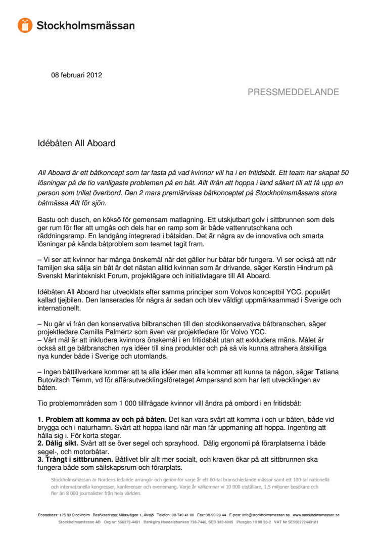 All Aboard är ett båtkoncept som tar fasta på vad kvinnor vill ha i en fritidsbåt. Ett team har skapat 50 lösningar på de tio vanligaste problemen på en båt. Allt ifrån att hoppa i land säkert till att få upp en person som trillat överbord. Den 2 mars premiärvisas båtkonceptet på Stockholmsmässans stora båtmässa Allt för sjön.
