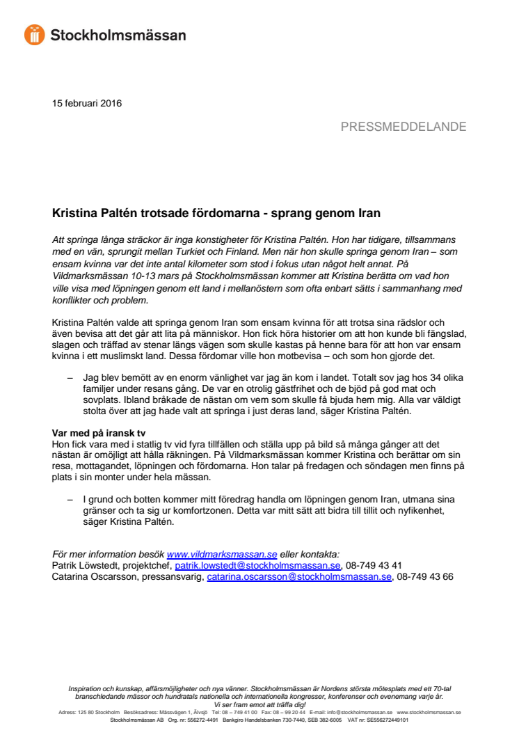 På Vildmarksmässan 10-13 mars på Stockholmsmässan kommer att Kristina berätta om vad hon ville visa med löpningen genom ett land i mellanöstern som ofta enbart sätts i sammanhang med konflikter och problem.