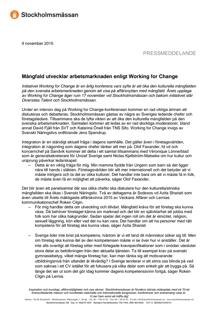 Working for Change är en årlig konferens vars syfte är att öka den kulturella mångfalden på den svenska arbetsmarknaden genom att visa på affärsnyttan med mångfald. Årets upplaga av Working for Change äger rum 17 november vid Stockholmsmässan och bakom initiativet står Diversitas Talent och Stockholmsmässan.