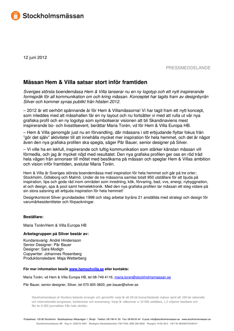 Sveriges största boendemässa Hem & Villa lanserar nu en ny logotyp och ett nytt inspirerande formspråk för all kommunikation om och kring mässan. Konceptet har tagits fram av designbyrån Silver och kommer synas publikt från hösten 2012.