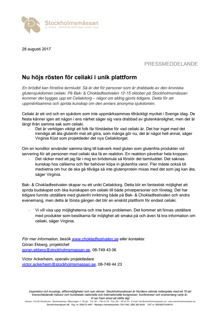 En brödsmula kan förstöra tarmludd. Så är det för personer som är drabbade av den kroniska glutensjukdomen celiaki. På Bak- & Chokladfestivalen 12-15 oktober på Stockholmsmässan kommer det byggas upp ett Celiakitorg – något som aldrig gjorts tidigare. Detta för att uppmärksamma och sprida kunskap om den annars anonyma sjukdomen.