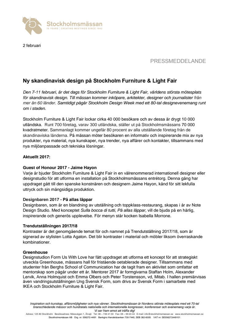 Den 7-11 februari, är det dags för Stockholm Furniture & Light Fair, världens största mötesplats för skandinavisk design. Till mässan kommer inköpare, arkitekter, designer och journalister från mer än 60 länder. Samtidigt pågår Stockholm Design Week med ett 80-tal designevenemang runt om i staden.