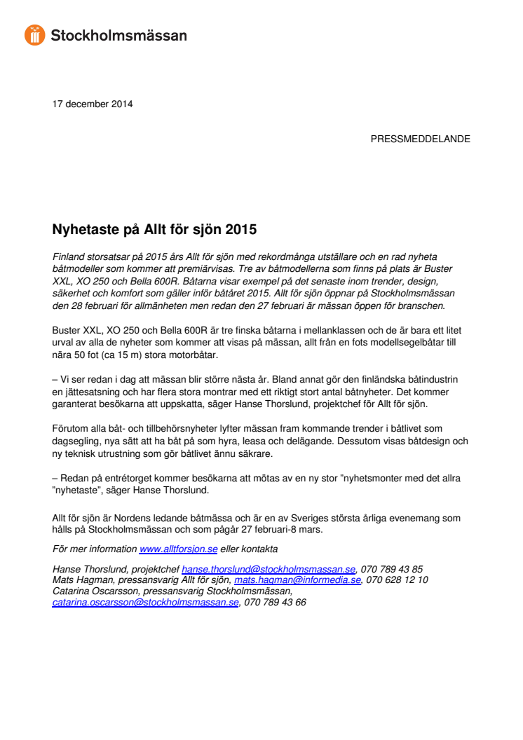 Finland storsatsar på 2015 års Allt för sjön med rekordmånga utställare och en rad nyheta båtmodeller som kommer att premiärvisas. Tre av båtmodellerna som finns på plats är Buster XXL, XO 250 och Bella 600R. Båtarna visar exempel på det senaste inom trender, design, säkerhet och komfort. Allt för sjön öppnar den 28 februari för allmänheten och den 27 februari för branschen.