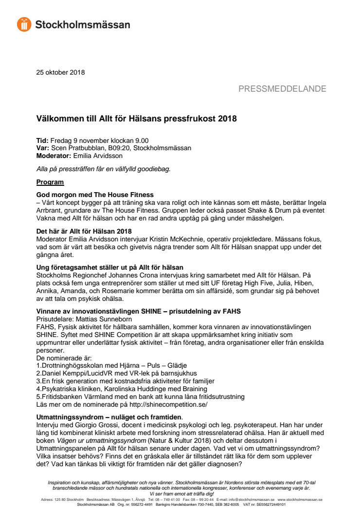 Välkommen till Allt för Hälsans pressfrukost 2018. Tid: Fredag 9 november klockan 9.00. Var: Scen Pratbubblan, B09:20, Stockholmsmässan. Moderator: Emilia Arvidsson