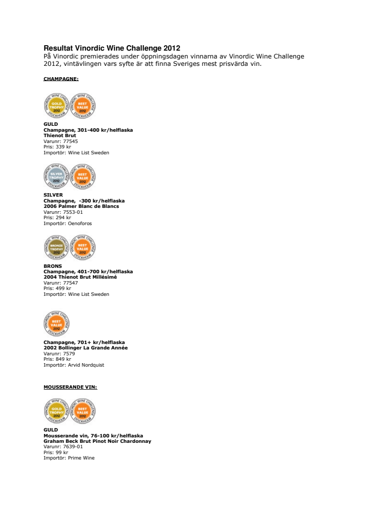 Vinordic Wine Challenge, Sveriges enda EU-certifierade vinprovning, har korat årets bästa viner. Nära 700 viner konkurrerade i 37 olika klasser inom tio olika smaktyper. Inom varje kategorier utses sedan en guld-, silver- och bronsvinnare. Här hittar du Sveriges mest prisvärda viner.