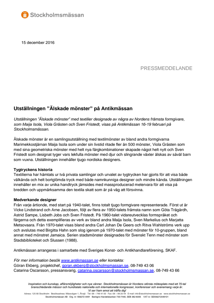 Utställningen ”Älskade mönster” med textilier designade av några av Nordens främsta formgivare, som Maija Isola, Viola Gråsten och Sven Fristedt, visas på Antikmässan 16-19 februari på Stockholmsmässan.