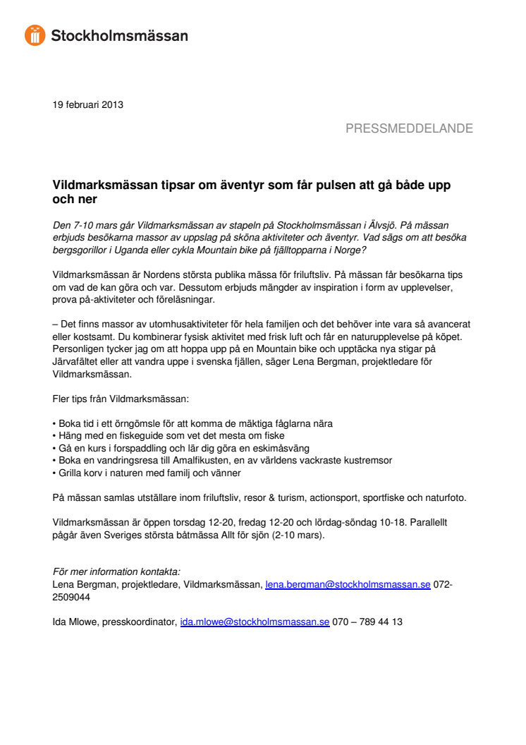 Den 7-10 mars går Vildmarksmässan av stapeln på Stockholmsmässan i Älvsjö. På mässan erbjuds besökarna massor av uppslag på sköna aktiviteter och äventyr. Vad sägs om att besöka bergsgorillor i Uganda eller cykla Mountain bike på fjälltopparna i Norge?