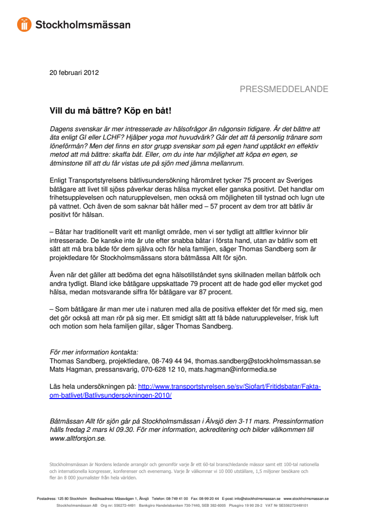 Dagens svenskar är mer intresserade av hälsofrågor än någonsin tidigare. Är det bättre att äta enligt GI eller LCHF? Hjälper yoga mot huvudvärk? Går det att få personlig tränare som löneförmån? Men det finns en stor grupp svenskar som på egen hand upptäckt en effektiv metod att må bättre: skaffa båt. Om du inte har möjlighet att köpa en egen, se då till att du får vistas på sjön lite då och då.