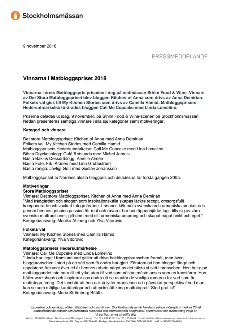 Nu är vinnarna i årets Matbloggspris utsedda och prisade. Vinnare av Det Stora Matbloggspriset blev bloggen Kitchen of Anna som drivs av Anna Demirian. Folkets val gick till My Kitchen Stories som drivs av Camilla Hamid. Matbloggsprisets Hedersutmärkelse förärades bloggen Call Me Cupcake med Linda Lomelino.