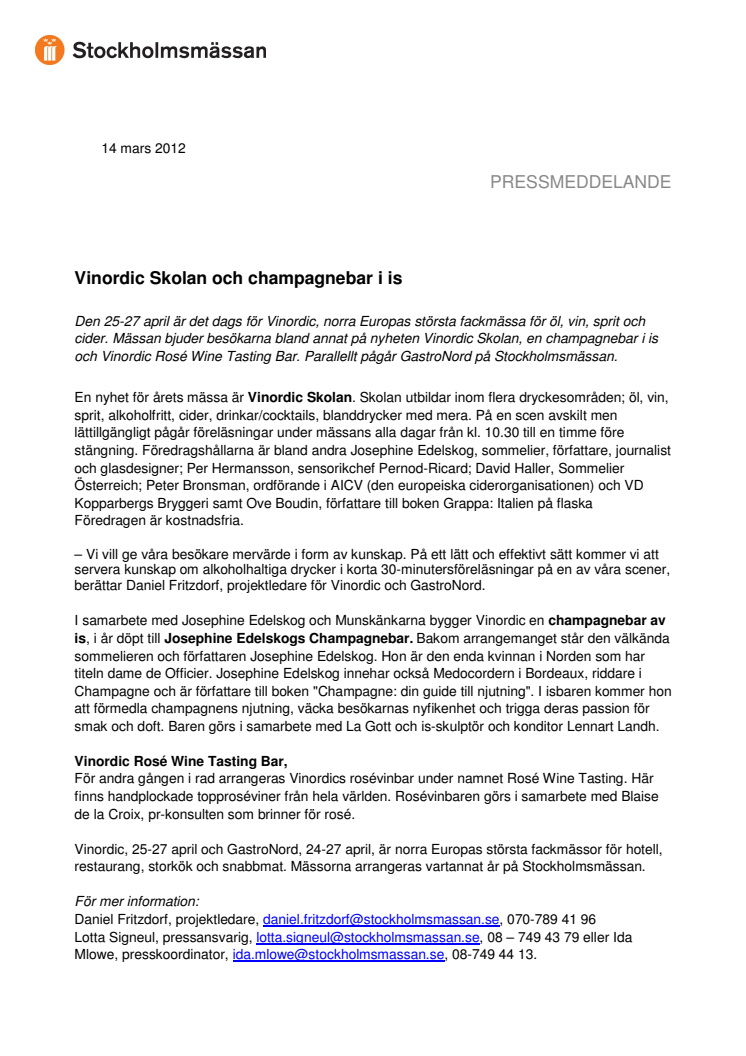 Den 25-27 april är det dags för Vinordic, norra Europas största fackmässa för öl, vin, sprit och cider. Mässan bjuder besökarna bland annat på nyheten Vinordic Skolan, en champagnebar i is och Vinordic Rosé Wine Tasting Bar. Parallellt pågår GastroNord på Stockholmsmässan.