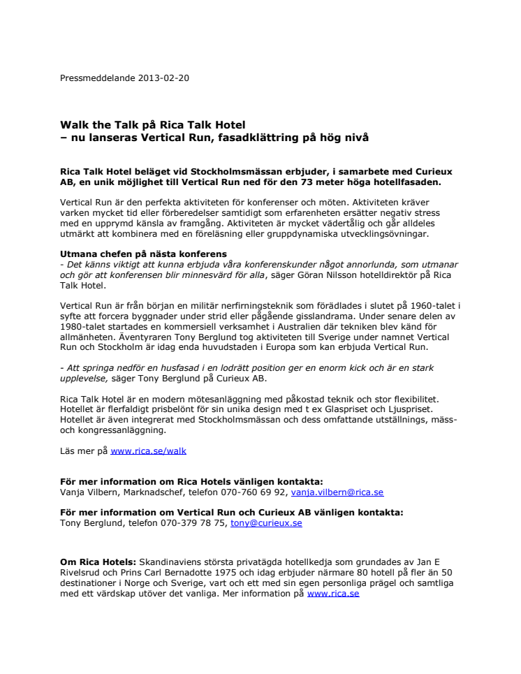 Rica Talk Hotel beläget vid Stockholmsmässan erbjuder, i samarbete med Curieux AB, en unik möjlighet till Vertical Run ned för den 73 meter höga hotellfasaden.