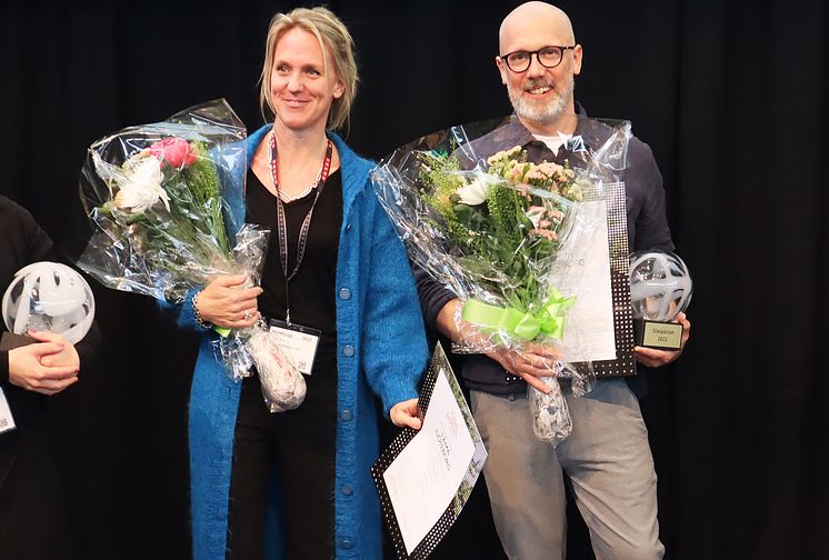 Glada miner när Glaspärlan delades ut till konsthallen Långedrag Modern Art. Jenny Stening från Steg Arkitekter och Johan Wennroth från Kungens Glasmästeri tog emot priset.