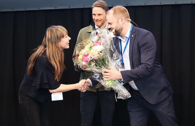 Pernilla Remröd från Ahrbom och Partner Arkitekter och Sebastian Westin från Westins Fönsterteknik AB tar emot Glaspriset för renoveringen av Kulturhuset i Stockholm.