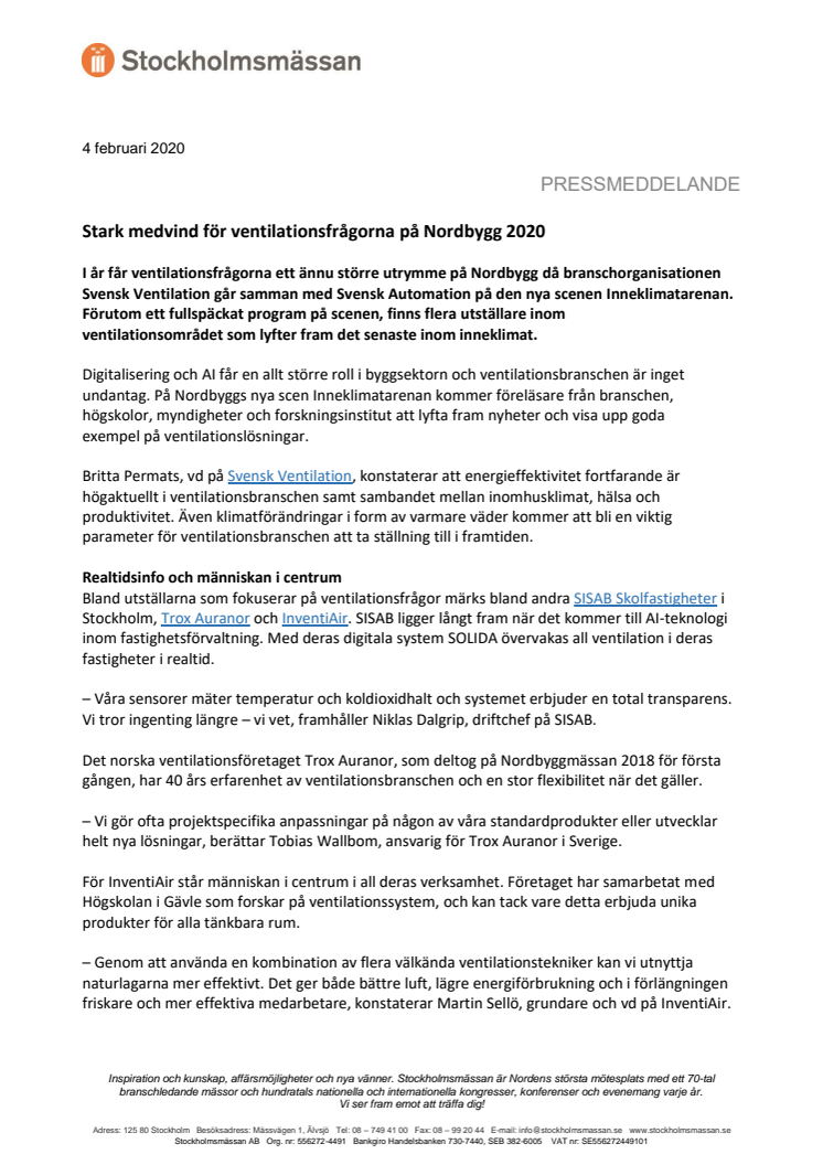 • Stark medvind för ventilationsfrågorna på Nordbygg 2020