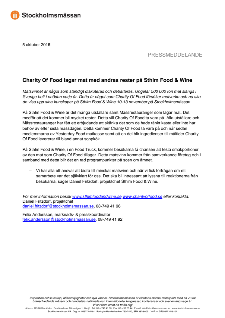 För mer information besök www.sthlmfoodandwine.se www.charityoffood.se eller kontakta: