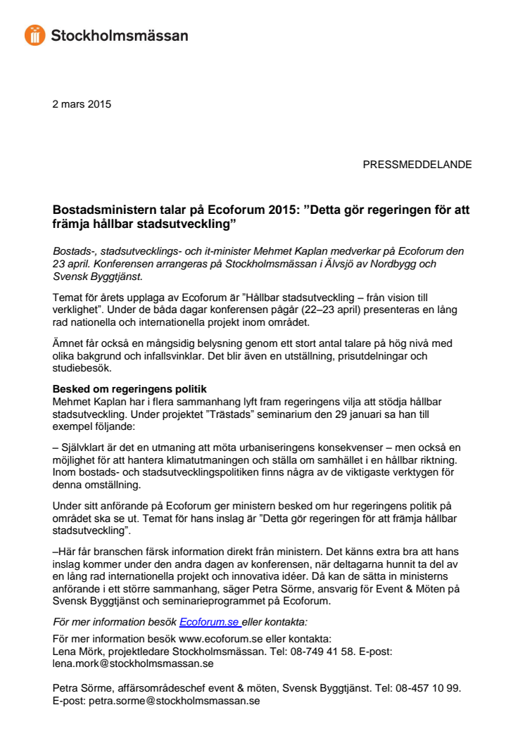 - Här får branschen färsk information direkt från ministern. Det känns extra bra att hans inslag kommer under den andra dagen av konferensen, när deltagarna hunnit ta del av en lång rad internationella projekt och innovativa idéer. Då kan de sätta in ministerns anförande i ett större sammanhang, säger Petra Sörme, ansvarig för Event & Möten på Svensk Byggtjänst och seminarieprogrammet på Ecoforum.