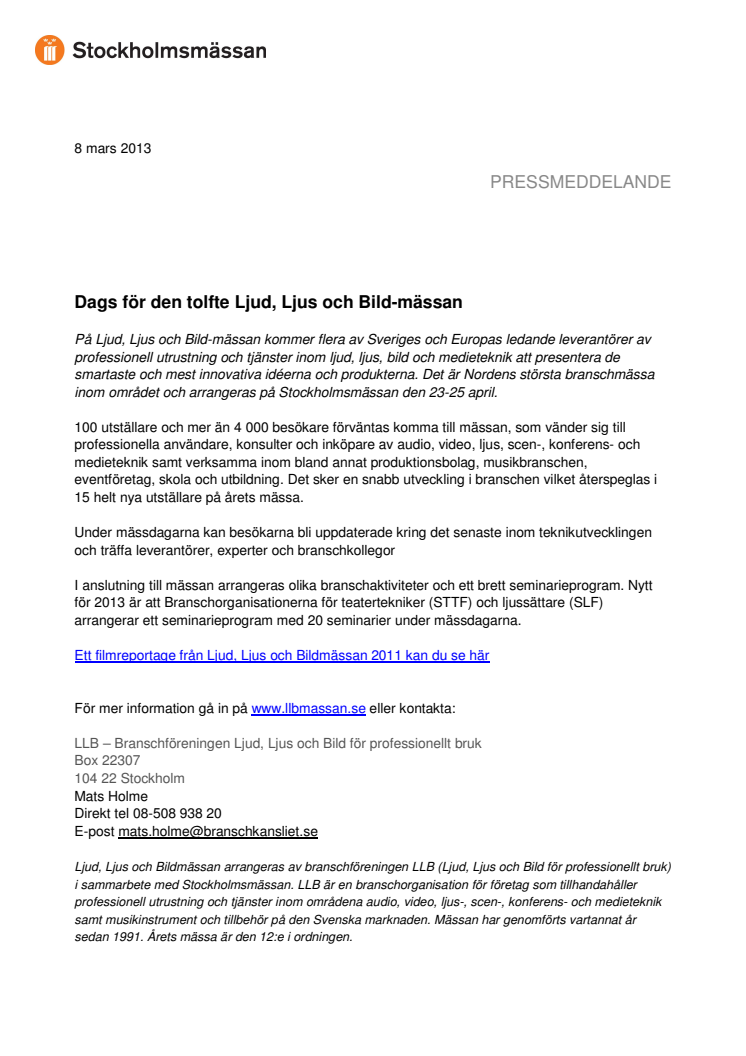 På Ljud, Ljus och Bild-mässan kommer flera av Sveriges och Europas ledande leverantörer av professionell utrustning och tjänster inom ljud, ljus, bild och medieteknik att presentera de smartaste och mest innovativa idéerna och produkterna. Det är Nordens största branschmässa inom området och arrangeras på Stockholmsmässan den 23-25 april.