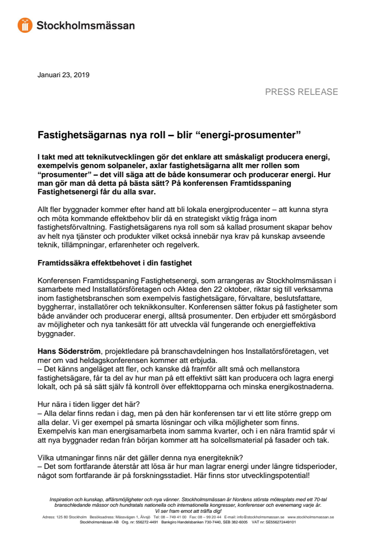 Konferensen Framtidsspaning Fastighetsenergi, som arrangeras av Stockholmsmässan i samarbete med Installatörsföretagen och Aktea den 22 oktober, riktar sig till verksamma inom fastighetsbranschen som exempelvis fastighetsägare, förvaltare, beslutsfattare, byggherrar, installatörer och teknikkonsulter.Konferensen sätter fokus på fastigheter som både använder och producerar energi, alltså prosumenter. Den erbjuder ett smörgåsbord av möjligheter och nya tankesätt för att utveckla väl fungerande och energieffektiva byggnader.