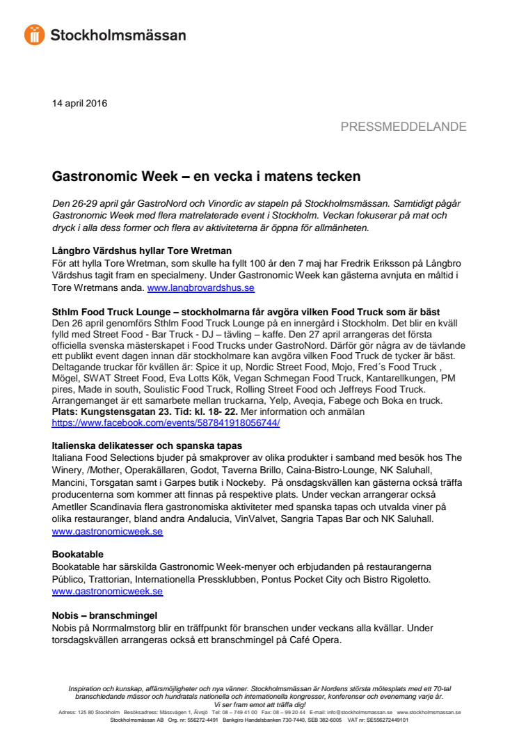 Den 26-29 april går GastroNord och Vinordic av stapeln på Stockholmsmässan. Samtidigt pågår Gastronomic Week med flera matrelaterade event i Stockholm. Veckan fokuserar på mat och dryck i alla dess former och flera av aktiviteterna är öppna för allmänheten.