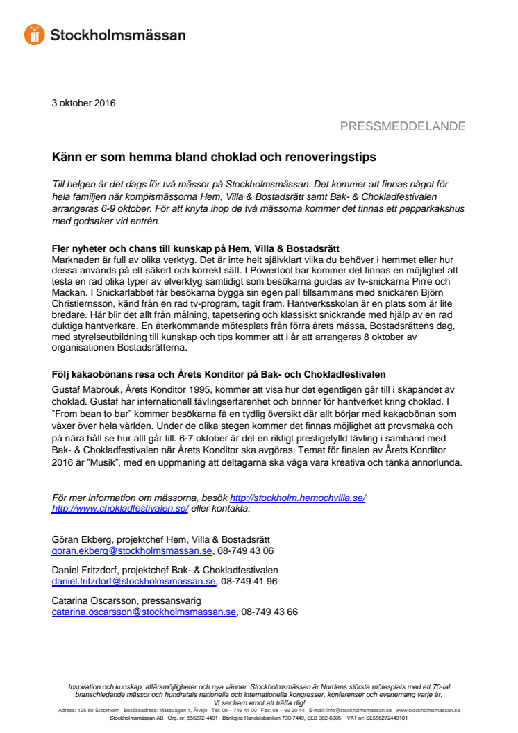 För mer information om mässorna, besök http://stockholm.hemochvilla.se/ http://www.chokladfestivalen.se/ eller kontakta: