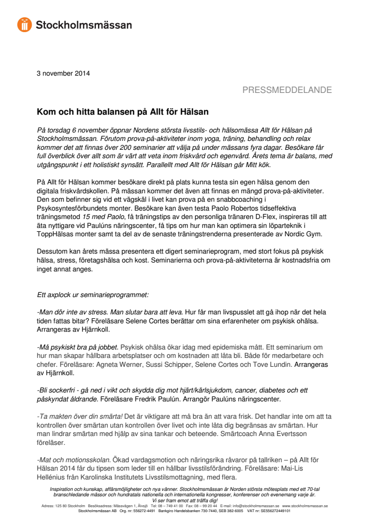 På torsdag 6 november öppnar Nordens största livsstils- och hälsomässa Allt för Hälsan på Stockholmsmässan. Förutom prova-på-aktiviteter inom yoga, träning, behandling och relax kommer det att finnas över 200 seminarier att välja på under mässans fyra dagar. Besökare får full överblick över allt som är värt att veta inom friskvård och egenvård. Årets tema är balans, med utgångspunkt i ett holistiskt synsätt. Parallellt med Allt för Hälsan går Mitt kök.