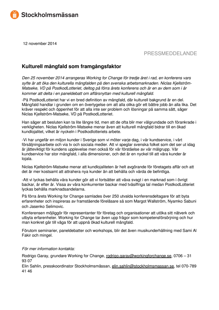 Den 25 november 2014 arrangeras Working for Change för tredje året i rad, en konferens vars syfte är att öka den kulturella mångfalden på den svenska arbetsmarknaden. Niclas Kjellström-Matseke, VD på PostkodLotteriet, deltog på förra årets konferens och är en av dem som i år kommer att delta i en paneldebatt om affärsnyttan med kulturell mångfald.